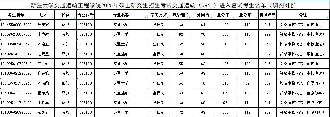 bwin中国官网2025年硕士研究生招生考试交通运输(0861)进入复试考生名单(调剂3批)