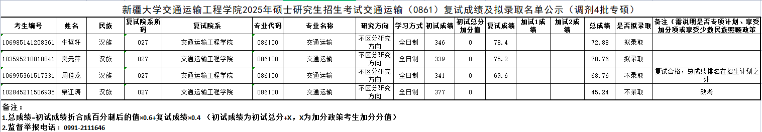 bwin中国官网2025年硕士研究生招生考试交通运输(0861)复试成绩及拟录取名单公示(调剂4批专硕)