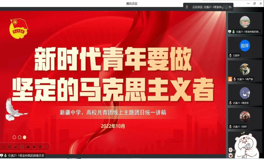 为贯彻落实自治区团委和校团委关于近期要组织好各团支部学习马克思主义,引领团员青年做新时代坚定的青年马克思主义者的相关安排,10月12日下午,交通运输工程学院组织各团支部在线上开展了“新时代青年要做坚定的马克思主义者”主题团日活动。活动由各班团支部书记主持进行。